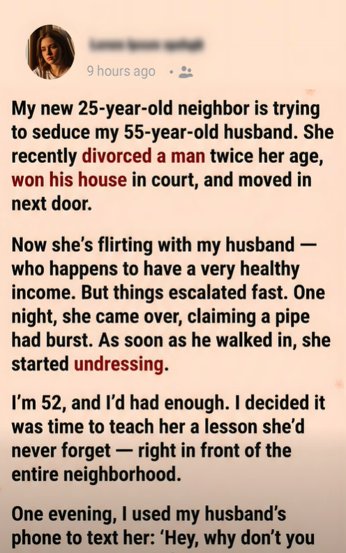 The aftermath was swift. She couldn’t walk to her mailbox without the neighbors snickering. Mrs. Higgins made sure the story reached three towns over by the next morning. A “For Sale” sign went up in Tiffany’s yard less than a week later. She moved out in the middle of the night, and my husband and I have enjoyed our peace and quiet ever since.