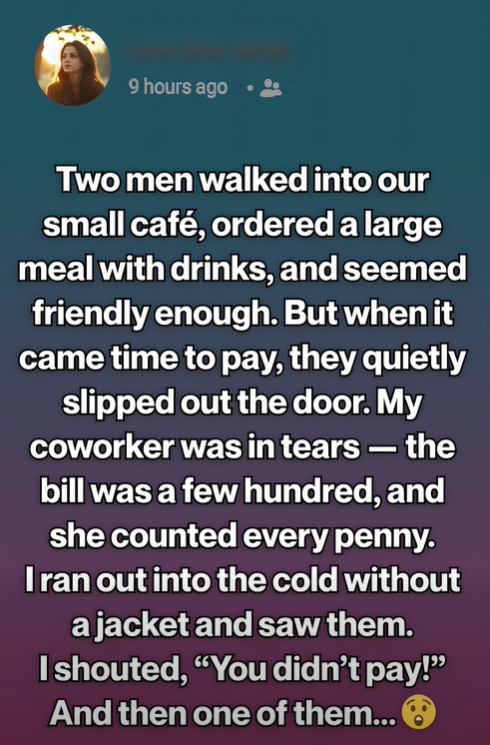 The night had been slow—the kind of quiet winter evening where the cold pressed against the café windows and the street outside felt almost abandoned. The heaters hummed softly, and the smell of coffee and grilled food lingered in the air. I was wiping down the counter when the door opened and two men stepped inside, stamping snow from their boots.