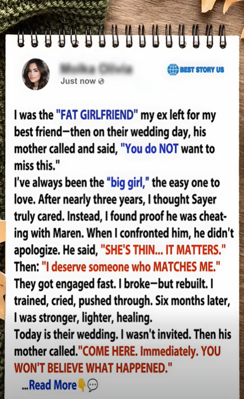 I was the “fat girlfriend” my ex dumped for my best friend—then on their wedding day, his mom called me and said, “You do NOT want to miss this.”