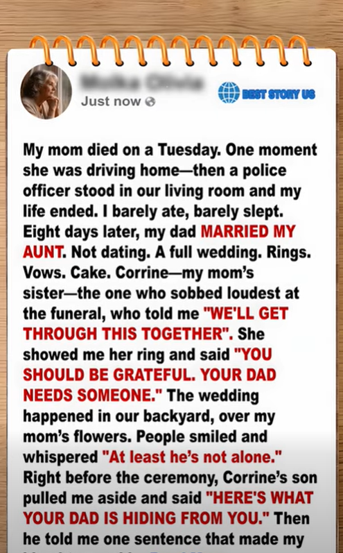 My Dad Married My Aunt 8 Days After My Mom’s Death — but at Their Wedding, Her Son Took Me Aside and Said, ‘Here’s What Your Dad Is Hiding from You’
