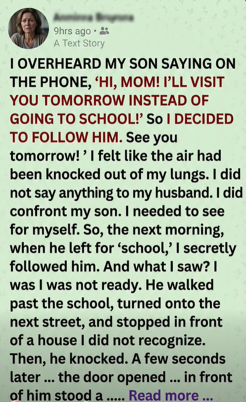 I OVERHEARD MY SON SAYING ON THE PHONE, ‘HI, MOM! I’LL VISIT YOU TOMORROW INSTEAD OF GOING TO SCHOOL!’ So I DECIDED TO FOLLOW HIM. See you tomorrow! ’ I felt like the air had been knocked out of my lungs. I did not say anything to my husband. I did not confront my son. I needed to see for myself. So, the next morning, when he left for ‘school,’ I secretly followed him. And what I saw? I was not ready. He walked past the school, turned onto the next street, and stopped in front of a house I did not recognize. Then, he knocked. A few seconds later … the door opened … in front of him stood a …..