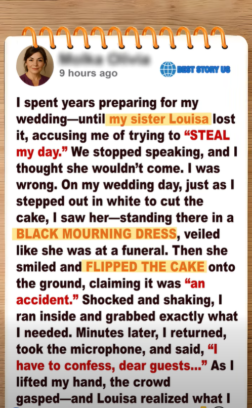She stood by the cake in a black mourning dress, with a dark veil over her face. The fabric clung to her in a dramatic way, heavy and deliberate. She looked as if she were at a funeral, not her older sister’s wedding.