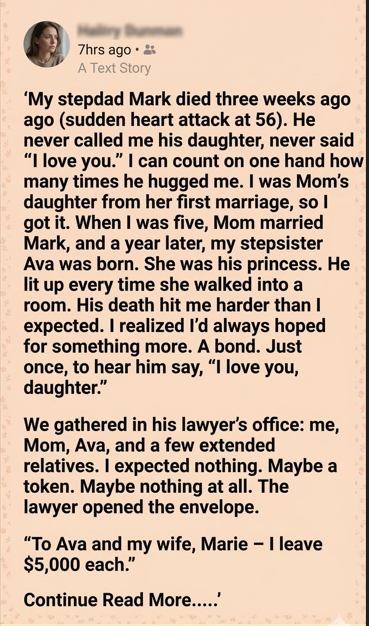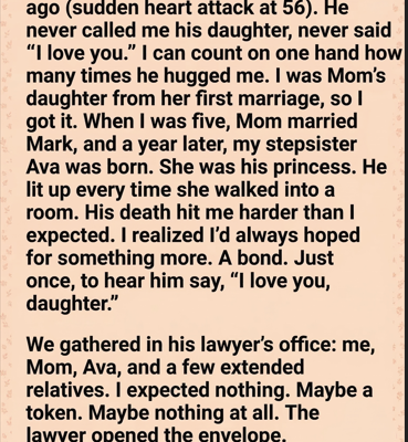 I wept. Not for the money, but for the recognition I’d craved my whole life. In the end, the man who never called me daughter gave me something more powerful than words—he gave me validation.
