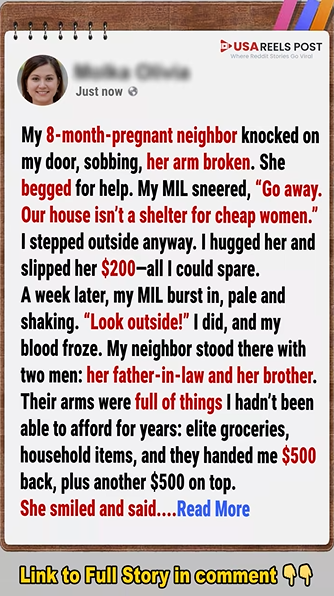 My 8-months-pregnant neighbor knocked on my door, sobbing, her arm broken. She begged for help. My mother-in-law sneered, “Go away. Our house isn’t a shelter for cheap women.”
