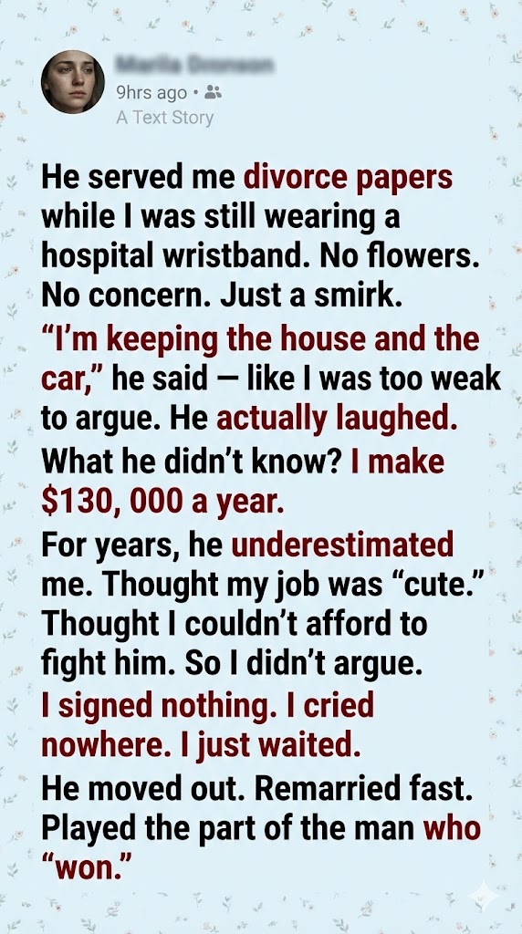 “I filed for divorce,” he announced, loud enough for the nurse to look over. “I’m taking the house and the car, lol.”