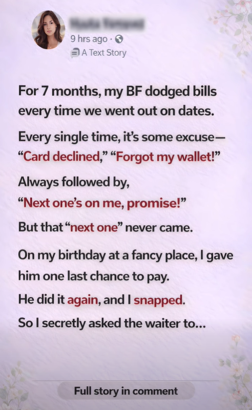 I’m seriously reeling from what happened last night with my boyfriend, Will. For seven months, he’s had this pattern of never paying when we go out. It’s every single time — “card declined,” “forgot my wallet,” “just paid a huge bill, can you cover it?” Always with the promise, “The next one is on me, for sure!” But that “next one” never happened. I’ve been footing the bill for everything, and honestly, it feels so disrespectful.