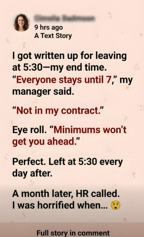 When I walked into the room, my manager was already there, wearing a smug expression, as if she’d finally caught me doing something wrong. But then HR said, “We’ve been reviewing the timesheets. Writing you up for leaving on time goes against company policy and your contract.