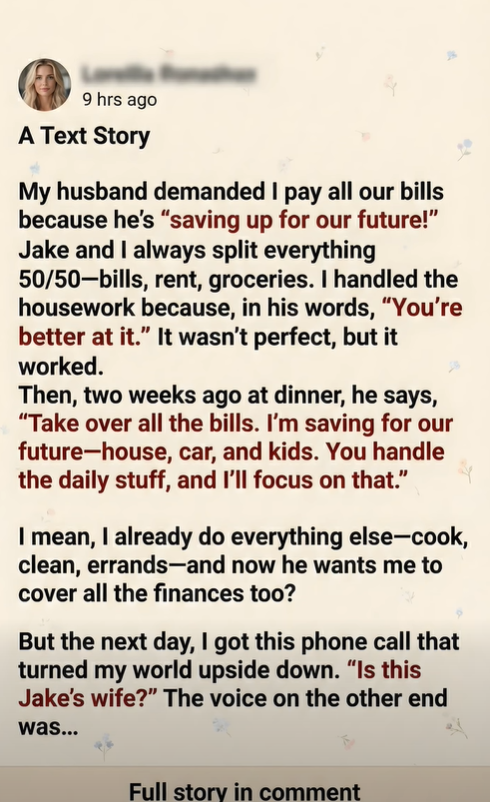 It all began with a strange request over dinner—one that didn’t quite make sense at the time. But the phone call that came just days later was what truly shattered everything I believed about my husband. My husband, Jake, and I had always seen ourselves as modern and fair.