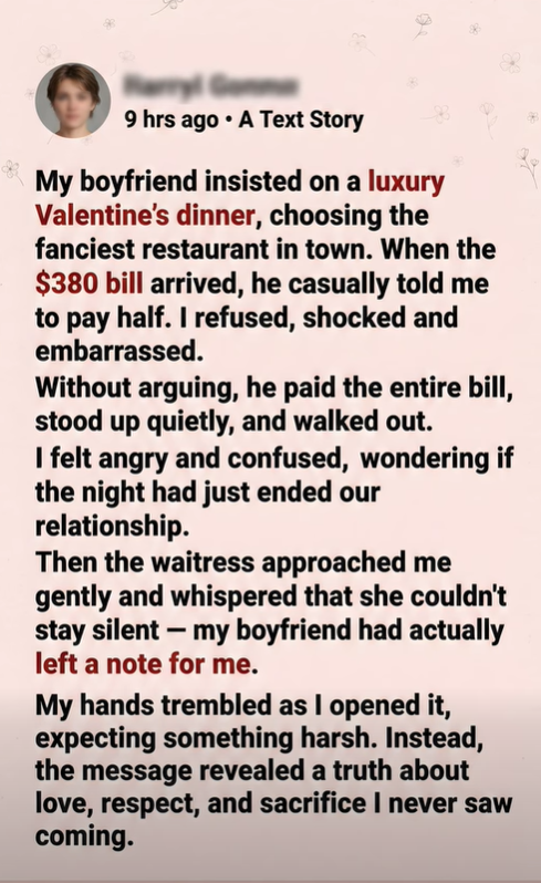 “It just feels weird,” I said carefully. “You planned this for Valentine’s. Why would I pay for half of the date you invited me to?”