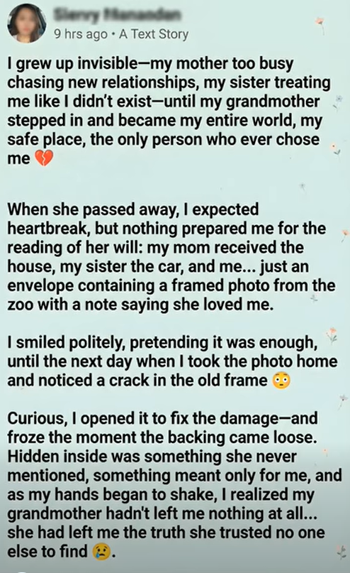 The next day, I went back to her house while my mom and sister were busy arguing over furniture. I took the framed photo from the wall—the one of us at the zoo when I was ten. I was grinning, missing a tooth. Grandma had her arm around me, eyes crinkled with joy.