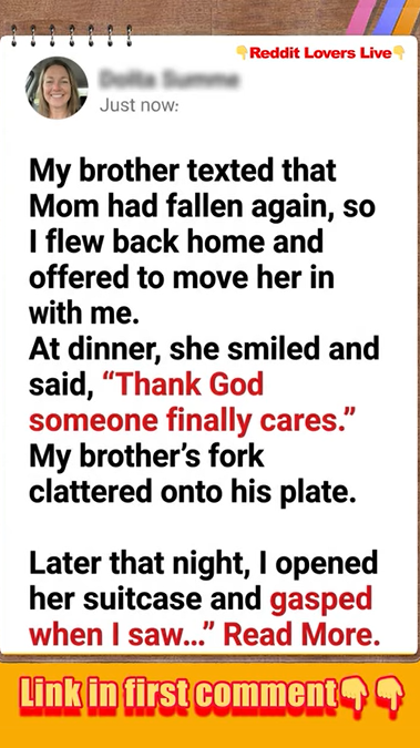 My brother texted that Mom had fallen again, so I flew back home and offered to move her in with me. At dinner, she smiled and said, “Thank God someone finally cares.” My brother’s fork clattered onto his plate. Later that night, I opened her suitcase and gasped when I saw……