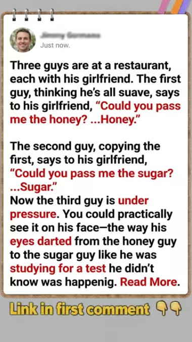 For the rest of dinner, the nickname stuck—half joke, half badge of honor. Every time Dave reached for something, the honey guy would say, “Careful, Hot Sauce,” and Dave’s girlfriend would laugh and roll her eyes like she’d just been given a title.