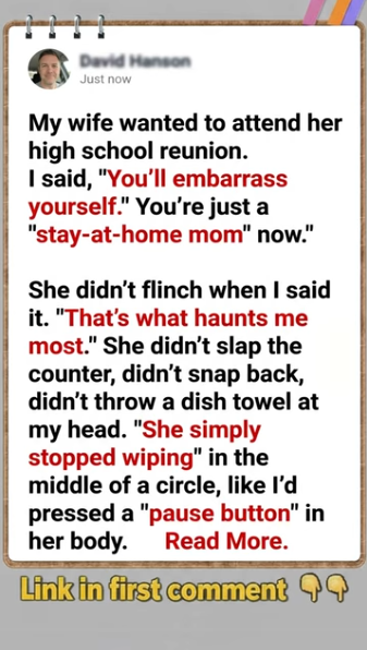 “I didn’t go,” she said, voice still level, “because I believed you. For a second, I believed you were right. I looked in the mirror and saw what you saw: a woman with a minivan, a messy bun, and no ‘impressive’ answer to that question people ask at reunions—What do you do?”