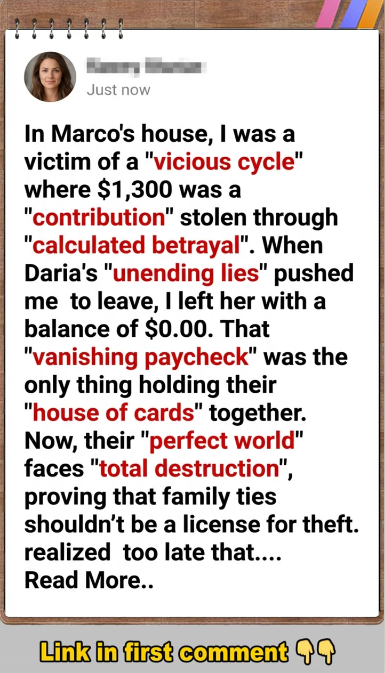 Marco eventually called me from a burner phone, his voice a broken whisper of “regret.” He confessed that he had known about the money but was too afraid of Daria’s “calculated betrayal” and her threats to leave him if he didn’t let her “manage” the finances. He had traded his sister’s trust for a “temporary peace” that turned out to be a “poisoned vow.” He was now facing a foreclosure notice and a lawsuit from the private lenders. I felt a “sacred fracture” in my heart for the brother I used to have, but the man on the phone was a stranger who had stood by while I was robbed. I told him that I hoped the $15,000 they had stolen over the year was worth the “shattered remains” of our relationship. I didn’t give him a “second chance,” because some betrayals aren’t mistakes—they are a “curriculum of cruelty.” The “outcome” for them was the loss of the house, a bankruptcy that would follow them for a decade, and a marriage that couldn’t survive the weight of its own “unending lies.”