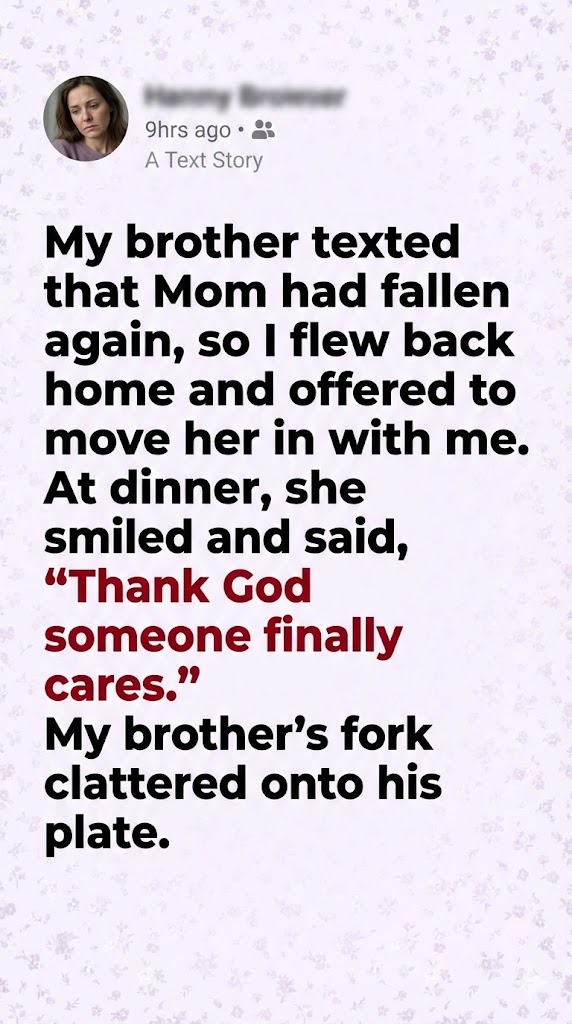 My brother texted that Mom had fallen again, so I flew back home and offered to move her in with me. At dinner, she smiled and said, “Thank God someone finally cares.” My brother’s fork clattered onto his plate. Later that night, I opened her suitcase and gasped when I saw……