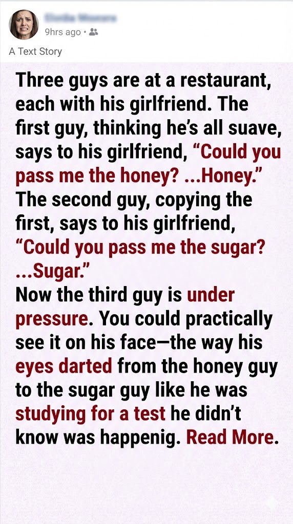 His girlfriend rolled her eyes in a way that still looked affectionate. She slid the honey across the table. “You’re ridiculous,” she said, smiling anyway.