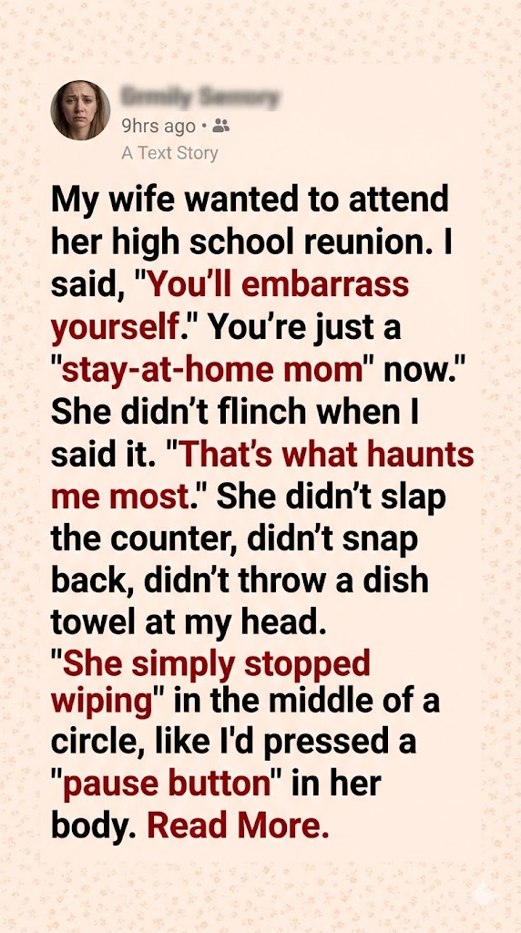 “I didn’t go,” she said, voice still level, “because I believed you. For a second, I believed you were right. I looked in the mirror and saw what you saw: a woman with a minivan, a messy bun, and no ‘impressive’ answer to that question people ask at reunions—What do you do?”