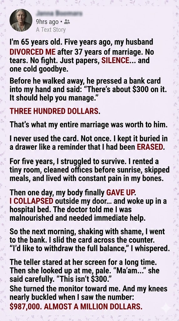 I kept it in a drawer, untouched, because swiping it felt like agreeing with him—that my life had been worth so little. After the divorce, everything fell apart quietly. I rented a narrow room behind an aging grocery store. I cleaned office buildings before dawn. Some nights I went to bed hungry. Pain became a constant companion. Pride was the only thing I still owned.