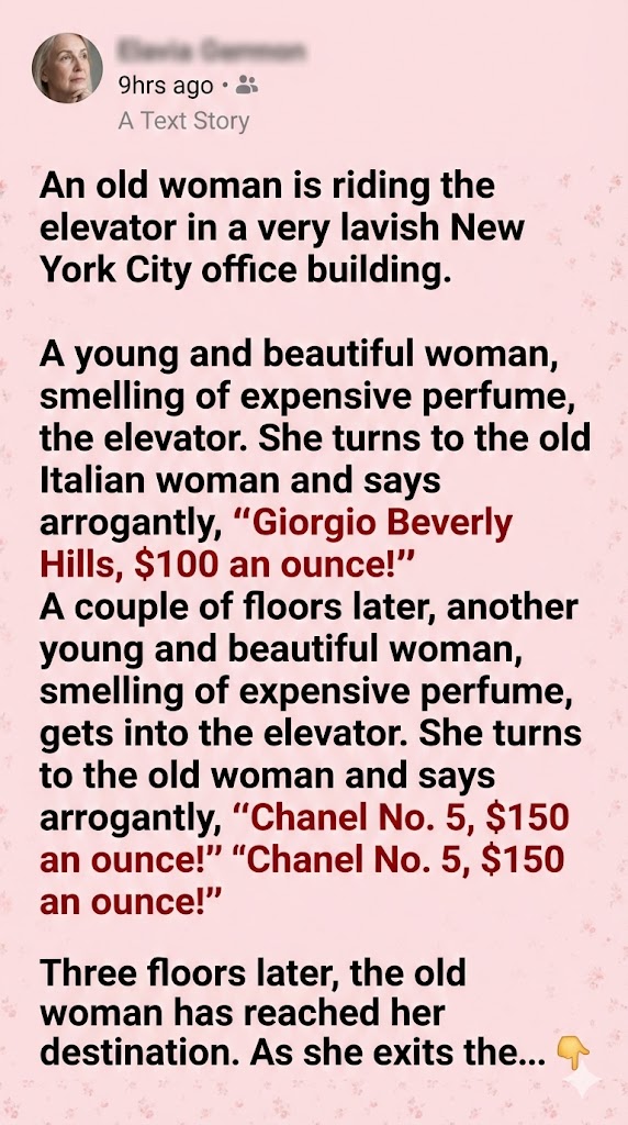 At the next floor, the doors opened again, revealing a young woman — tall, graceful, wrapped in a cloud of confidence and the scent of Giorgio Beverly Hills, a hundred dollars an ounce. Her heels clicked like punctuation marks as she smiled politely. “Lovely day,” the young woman said, adjusting her silk scarf.