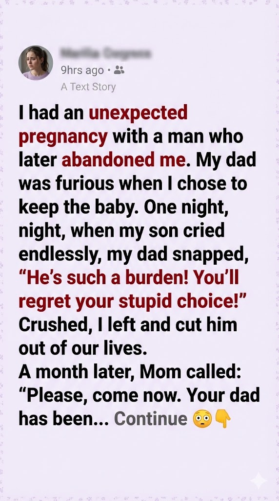 My chest tightened, tears blurred my vision, and I knew I couldn’t stay any longer. That night, I packed my things, gathered my son into my arms, and walked out. I made a promise to myself that my father would no longer be part of our lives.