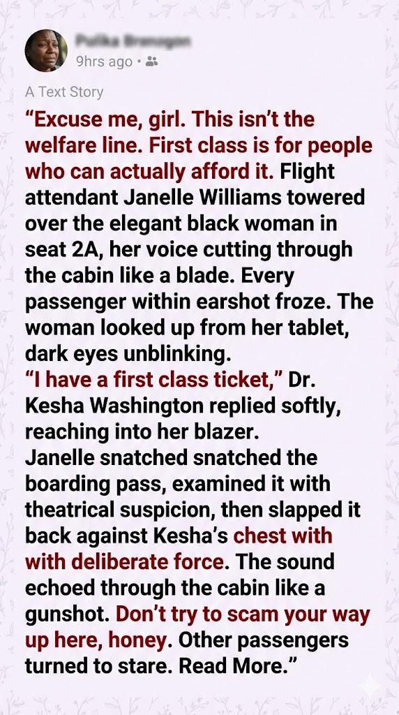 “”I have a first class ticket,”” Dr. Kesha Washington replied softly, reaching into her blazer. Janelle snatched the boarding pass, examined it with theatrical suspicion, then slapped it back against Kesha’s chest with deliberate force. The sound echoed through the cabin like a gunshot. Don’t try to scam your way up here, honey. Other passengers turned to stare.