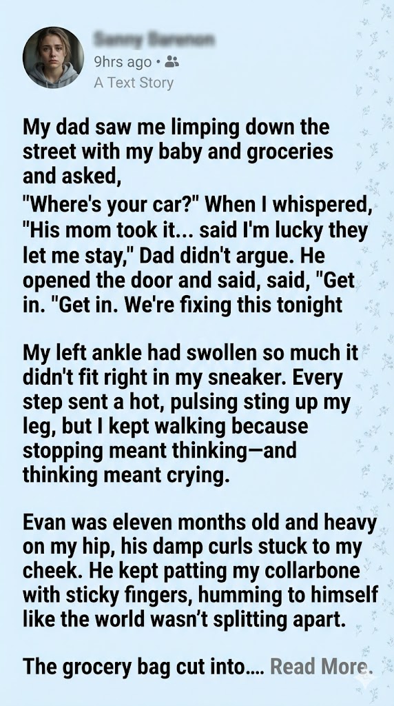 My dad saw me limping down the street with my baby and groceries and asked, “Where’s your car?” When I whispered, “His mom took it… said I’m lucky they let me stay,” Dad didn’t argue. He opened the door and said, “Get in. We’re fixing this tonight.