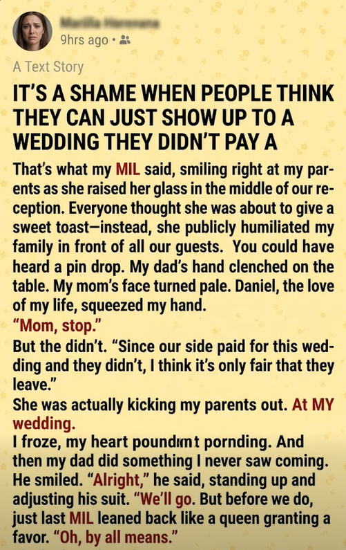 That’s what my MIL said, smiling right at my parents as she raised her glass in the middle of our reception. Everyone thought she was about to give a sweet toast—instead, she publicly humiliated my family in front of all our guests.