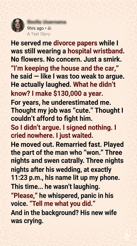 Three days after his wedding, at exactly 11:23 p.m., my phone lit up with his name. I almost ignored it. Almost. But I answered.