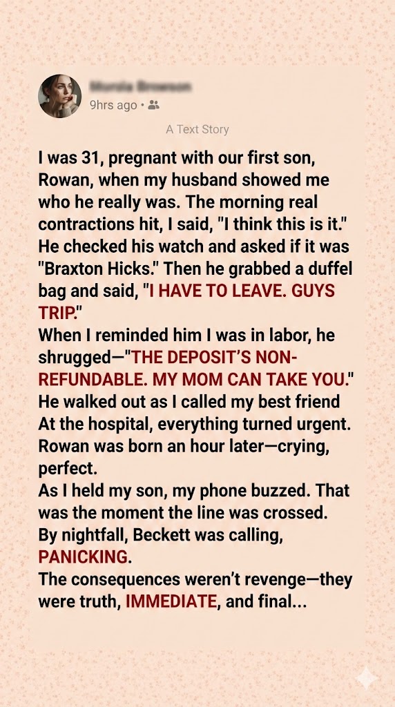 “Text me your contraction times,” she said. Her voice went flat and focused. “I’m leaving work right now. Do not drive. Do not wait for his mother.”