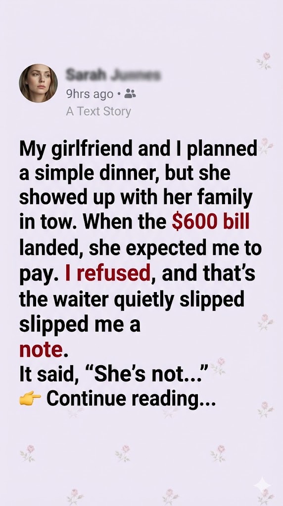 Nothing extravagant. Just a quiet Friday night at a mid-range restaurant downtown. We’d both had long weeks, and I thought it would be a nice chance to unwind, talk, and maybe discuss the next step in our relationship. We’d been together almost a year. I was starting to think about the future.