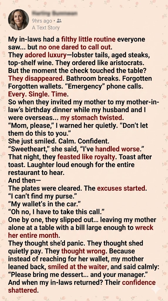 When my in-laws returned to the table, humiliated and silent, my mom smiled gently.