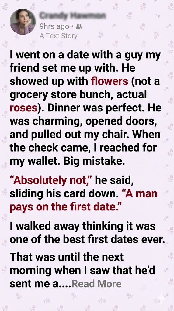 When Eric insisted on paying for our first date, I thought I’d met a true gentleman. Roses, a sweet gift, charming conversation — he was checking all the boxes. When he texted me the next day, I expected a cute follow-up, but my stomach dropped when I read his message.