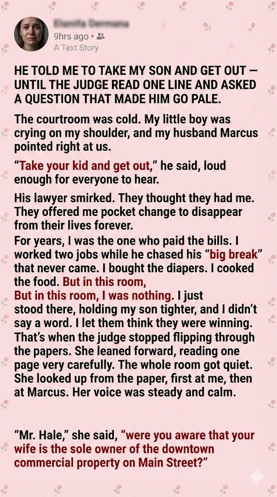 The courtroom was cold. My little boy, Thomas, was crying on my shoulder, and my husband Marcus pointed right at us. “Take your kid and get out,” he said, loud enough for the everyone to hear. His lawyer smirked. They thought they had me. They offered me the pocket change to disappear from their lives forever.