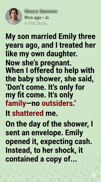 Emily opened it, expecting money. Instead, to her shock, there was a copy of the will I had intended to share—detailing a six-figure trust I had planned to create for their baby. But across the bottom, in my handwriting, I had added: ’Consider this void.