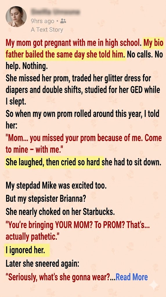 When I invited my mom to my senior prom to make up for the one she missed raising me alone, I thought it would be a simple act of love. But when my stepsister publicly humiliated her in front of everyone, I realized the night was about to become unforgettable for reasons nobody saw coming.