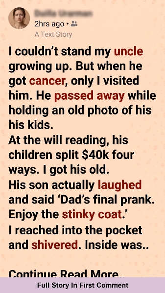 For a moment, I just held it there, my fingers trembling inside the lining of the coat. The room around me blurred—the lawyer still talking, my cousins whispering, someone chuckling—but all I could hear was the faint crackle of paper as I pulled it free.