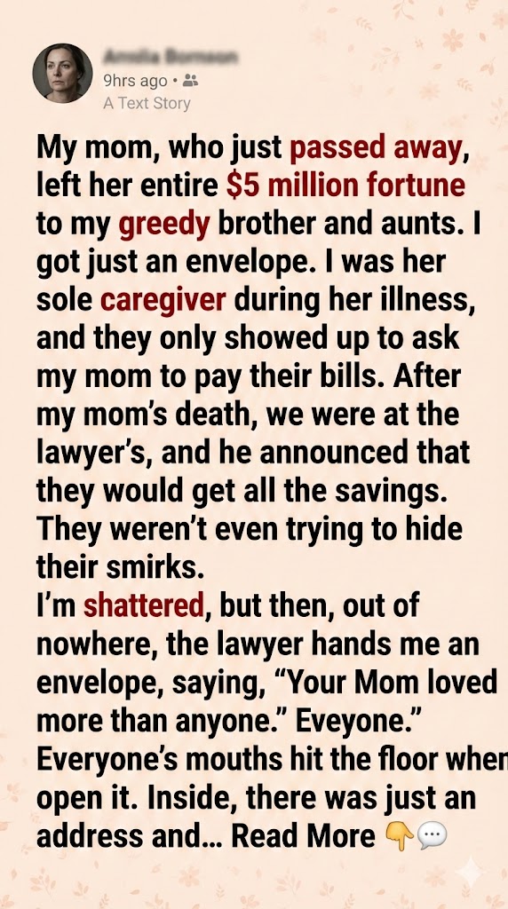 The lawyer cleared his throat, adjusting his spectacles. “And for you,” he said, his voice devoid of warmth, “your mother left… this.” He pushed a plain, cream-colored envelope across the polished mahogany table. No dramatic reveal, no explanation. Just a small, unassuming envelope. That was it.