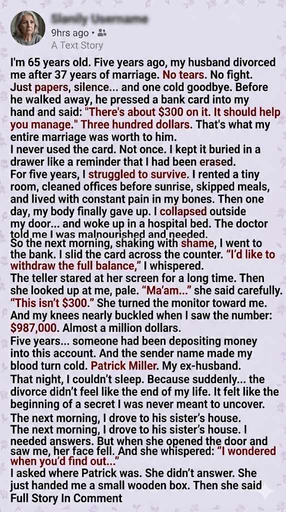 I kept it in a drawer, untouched, because swiping it felt like agreeing with him—that my life had been worth so little. After the divorce, everything fell apart quietly. I rented a narrow room behind an aging grocery store. I cleaned office buildings before dawn. Some nights I went to bed hungry. Pain became a constant companion. Pride was the only thing I still owned.