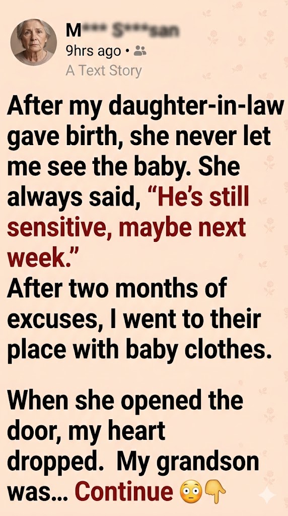 For two months after my daughter-in-law gave birth, I lived in a quiet storm of confusion and hurt. Every time I asked to visit the baby, she gave the same soft, distant answer: “He’s still sensitive… maybe next week.”