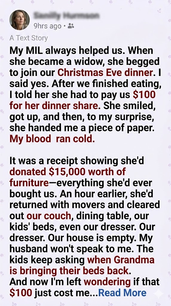 Then she handed me a piece of paper. It was a receipt showing she’d donated $15,000 worth of furniture. She said, “Now we’re even. Merry Christmas.” Then she left.