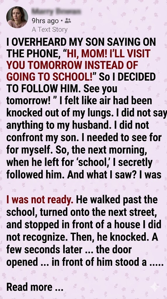 I OVERHEARD MY SON SAYING ON THE PHONE, ‘HI, MOM! I’LL VISIT YOU TOMORROW INSTEAD OF GOING TO SCHOOL!’ So I DECIDED TO FOLLOW HIM. See you tomorrow! ’ I felt like the air had been knocked out of my lungs. I did not say anything to my husband. I did not confront my son. I needed to see for myself. So, the next morning, when he left for ‘school,’ I secretly followed him. And what I saw? I was not ready. He walked past the school, turned onto the next street, and stopped in front of a house I did not recognize. Then, he knocked. A few seconds later … the door opened … in front of him stood a …..