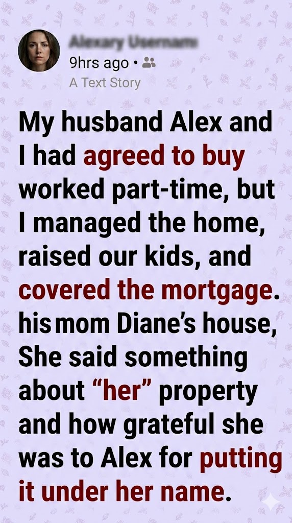 My husband Alex and I had agreed to buy our house together. It wasn’t a mansion, but it was ours — or at least, that’s what I believed. I worked part-time so I could raise our kids, manage the home, cook, clean, handle school meetings, doctor appointments, birthdays, bills — everything that kept our lives running. Alex covered the mortgage. We were a team.