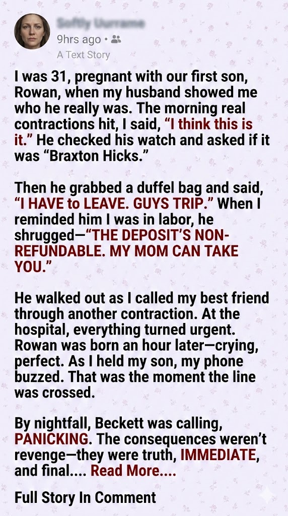 “Text me your contraction times,” she said. Her voice went flat and focused. “I’m leaving work right now. Do not drive. Do not wait for his mother.”
