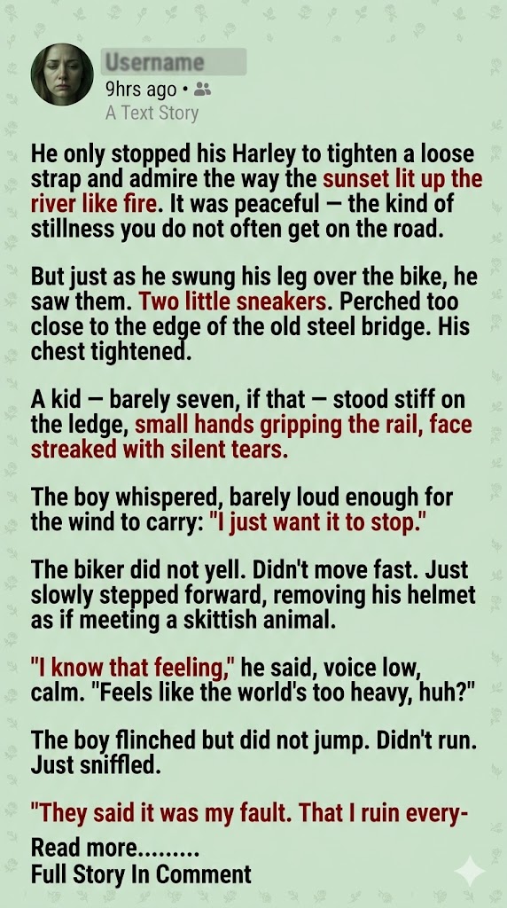 Jack sat him on the Harley. He took off his oversized helmet and placed it on the kid’s head; it wobbled comically, sliding over the boy’s eyes, and for the first time, a tiny, watery smile broke through the tears.
