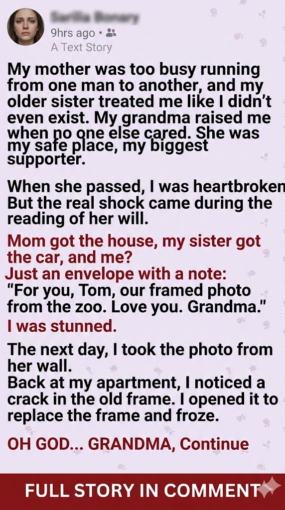 The next day, I went back to her house while my mom and sister were busy arguing over furniture. I took the framed photo from the wall—the one of us at the zoo when I was ten. I was grinning, missing a tooth. Grandma had her arm around me, eyes crinkled with joy.
