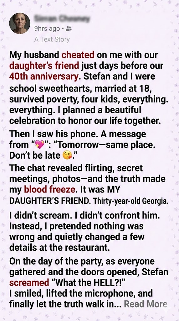 Days before our 40th anniversary celebration, I found flirty messages on my husband’s phone from my daughter’s best friend. What I felt went beyond heartbreak. Instead of confronting him, I planned something he’d never forget.