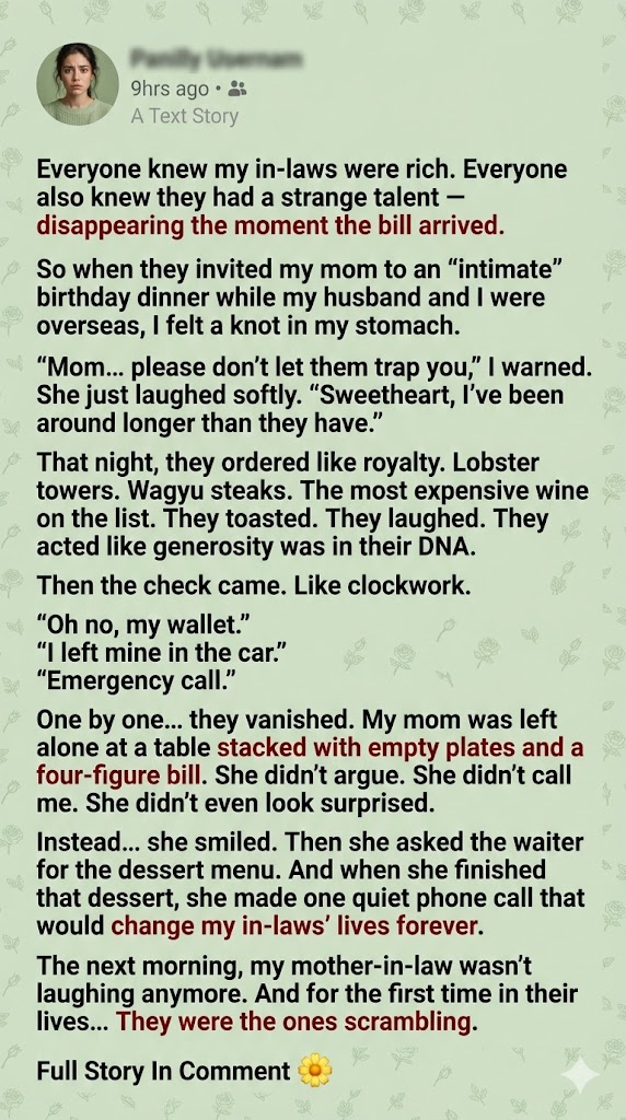 When they invited my mom to my mother-in-law’s birthday dinner while my husband and I were overseas for work, I felt uneasy.