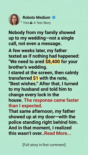 The healing process was incredibly slow and deeply painful, but with Thomas’s unwavering, patient support, I finally began to completely release the heavy, toxic burden of my misplaced, lingering guilt. We returned to our quiet, peaceful suburban home, ready to officially begin our new chapter entirely free from the suffocating, dramatic shadows of my past. Then, precisely one month after my wedding day, my cell phone vibrated violently on the kitchen counter, displaying an incoming text message from my father. My heart hammered a frantic, terrified rhythm against my ribs as I slowly opened the notification, foolishly hoping for a delayed, profound apology or a desperate, remorseful explanation for their horrific, unforgivable absence. Instead, I stared completely blankly at the glowing screen, my stomach churning with absolute, unadulterated disgust as I read the incredibly casual, profoundly audacious words he had typed. “We need $8,400 for your brother’s wedding,” the message demanded, completely ignoring the fact that they had just aggressively, publicly disowned me.