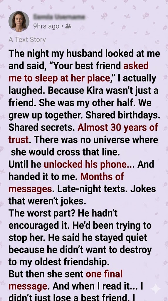 We met when we were five. Our moms became friends. We had sleepovers almost every weekend growing up. She was my maid of honor at my wedding. I was there when she went through her first heartbreak. We’d been in each other’s lives for nearly thirty years.