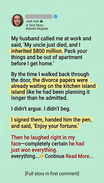 So yes—my husband called me at work and said his uncle had died and he inherited $800 million. He told me to pack my things and get out before he got home. By the time I returned, the divorce papers were waiting on the kitchen island like an ambush already dressed as paperwork. I signed them, handed him the pen, and said, “Enjoy your fortune.” Then he laughed right in my face, completely certain he had just won everything.
